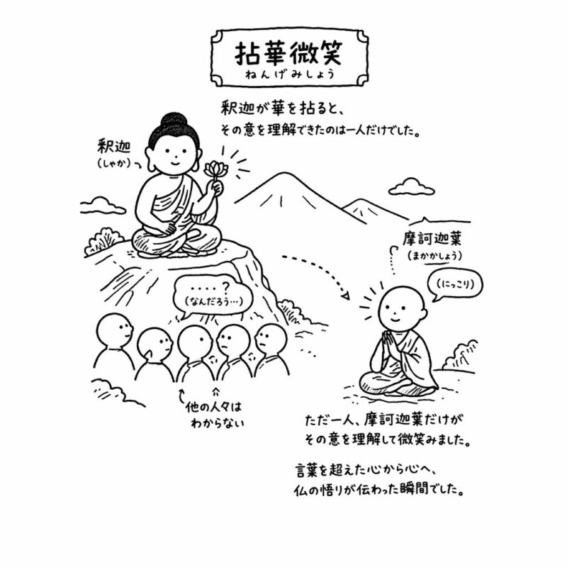 昔々、お釈迦様が霊鷲山(りょうじゅせん・古代インドのマガダ国にあった山)でお弟子さんに説法をしました。その際に、お釈迦様は一言も発することなく、捧げ物の花をひねります。お弟子さん達は意図が分からずポカン。でも弟子の一人、摩訶迦葉(まかかしょう)だけは、にっこりお釈迦様に微笑みを返します。お釈迦様は、それを見て「仏法のすべてを摩訶迦葉に授けた」と語りました。